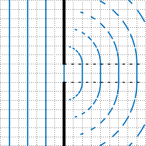 Dort sind (u. a.) das Huygenssche Prinzip und die Entstehung von Kreis- bzw. Zylinder bzw. Kugelwellen schön erklärt. Man findet dort auch eine noch schönere Darstellung des Phänomens der Beugung am Einfachspalt als die folgende Darstellung: